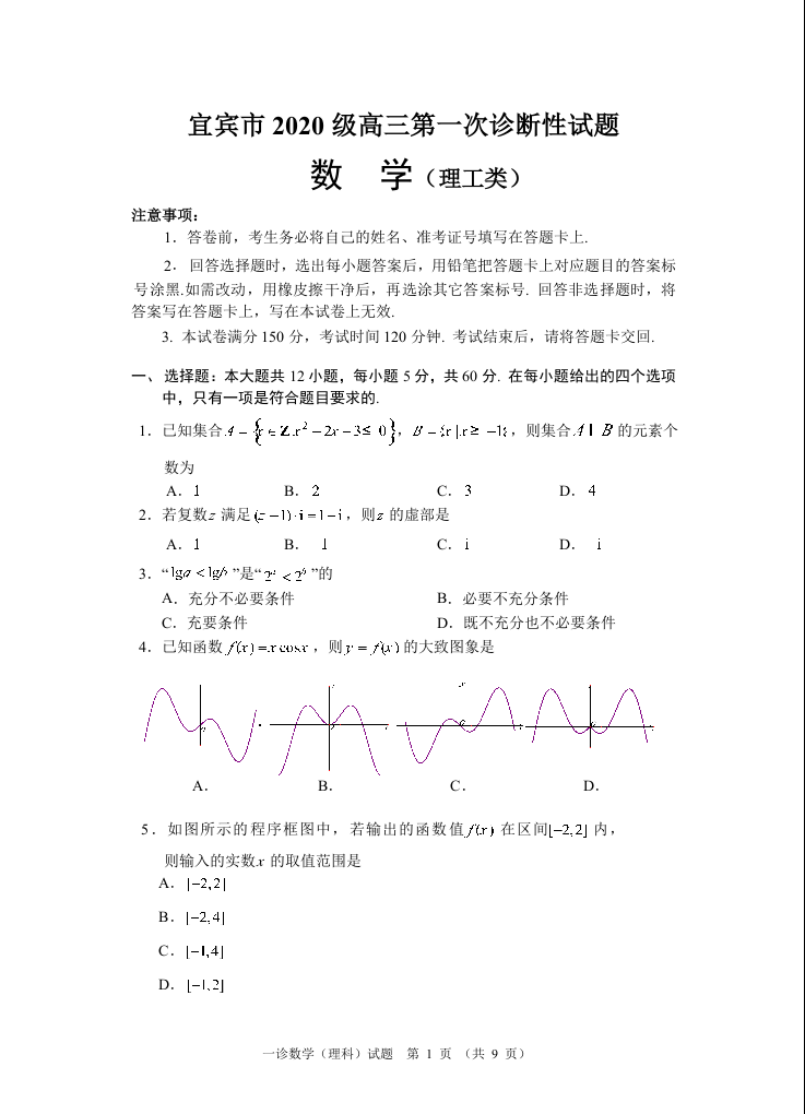 高三理数+答案--四川省宜宾市2023届高三上学期第一次诊断测试