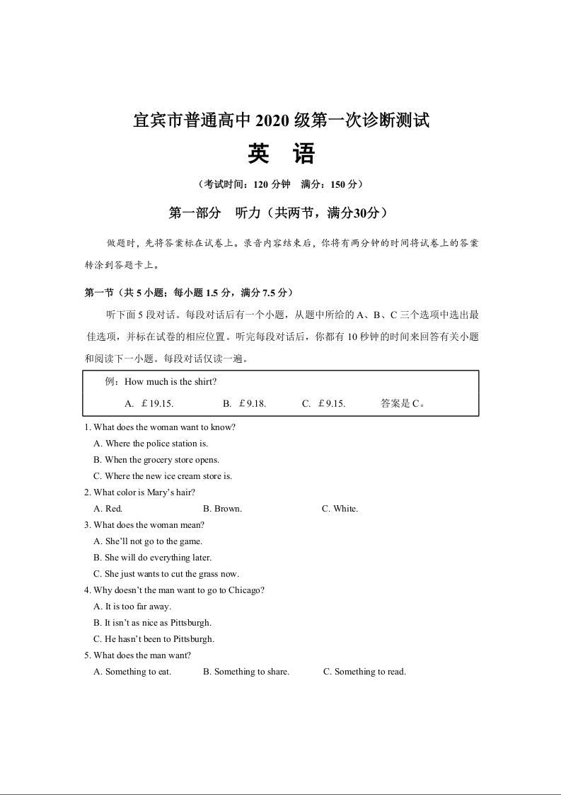 高三英语+答案--四川省宜宾市2023届高三上学期第一次诊断测试
