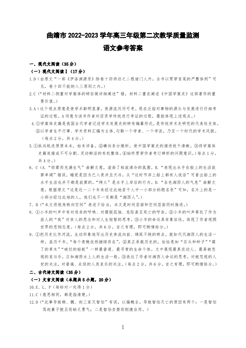 高三语文答案--云南省曲靖市2023届第二次教学质量检测