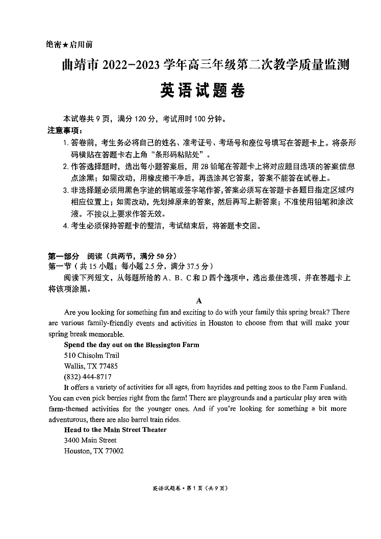 高三英语--云南省曲靖市2023届第二次教学质量检测