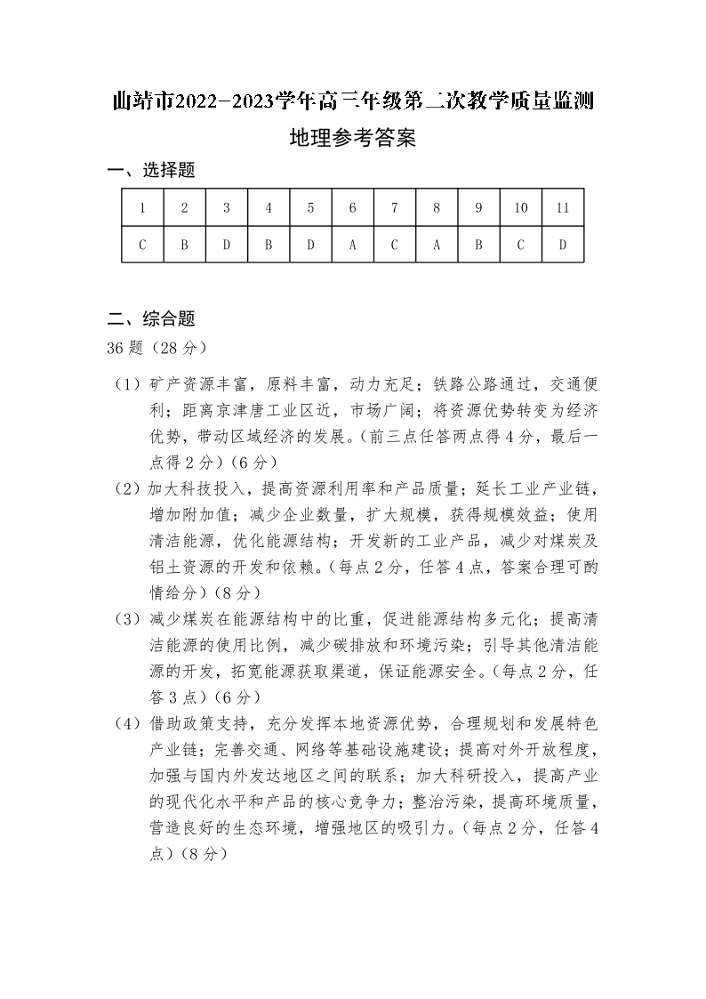 高三文综答案--云南省曲靖市2023届第二次教学质量检测