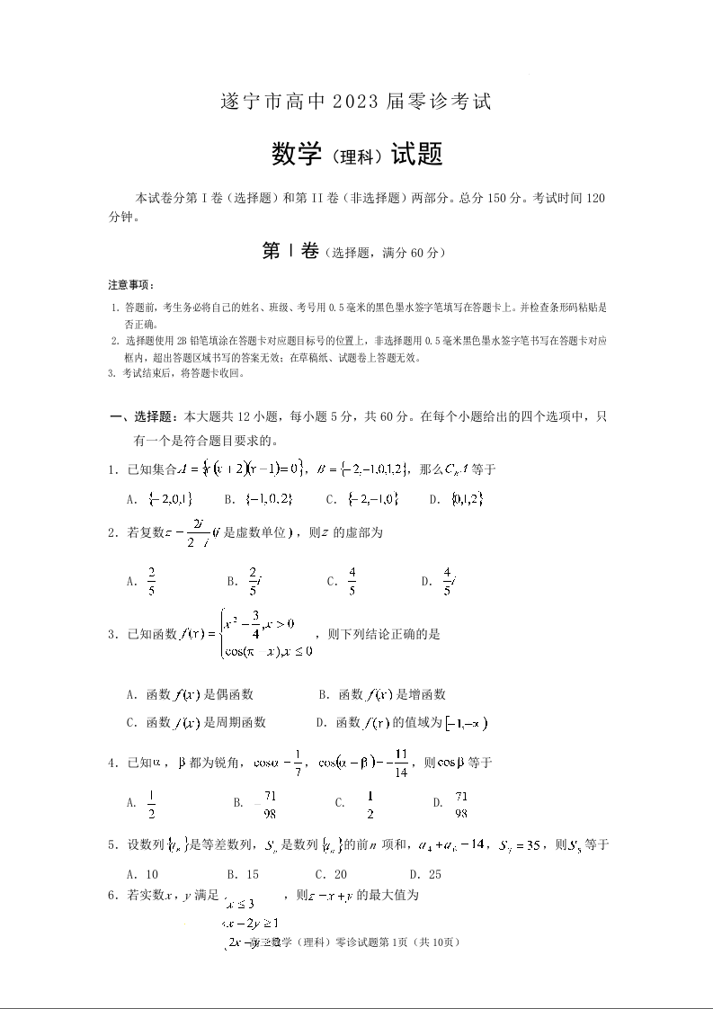高三理数+答案--四川省省遂宁市2023届高三上学期零诊考试