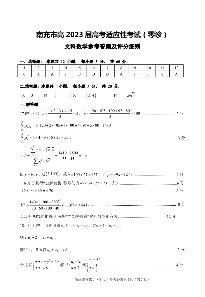 高三文科数学答案-四川省南充市2023届高三零诊
