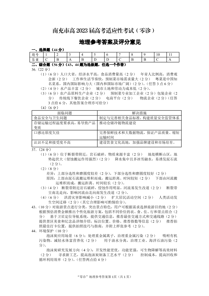 高三文综地理答案-四川省南充市2023届高三零诊