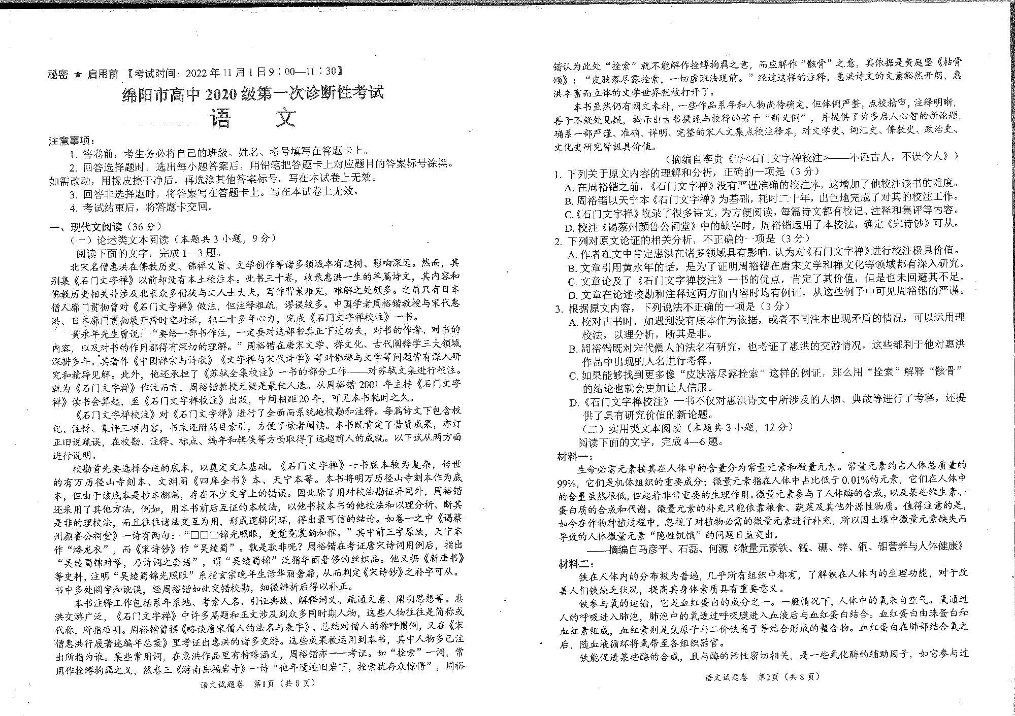 高三语文--四川省绵阳市2023届高三上学期第一次诊断性考试
