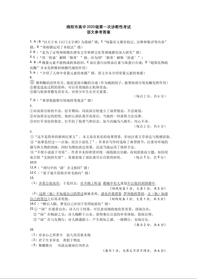 高三语文答案--四川省绵阳市2023届高三上学期第一次诊断性考试
