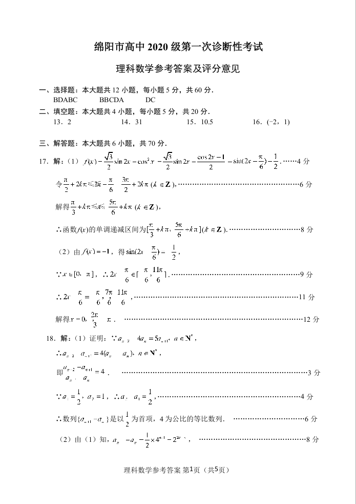高三理数答案--四川省绵阳市2023届高三上学期第一次诊断性考试