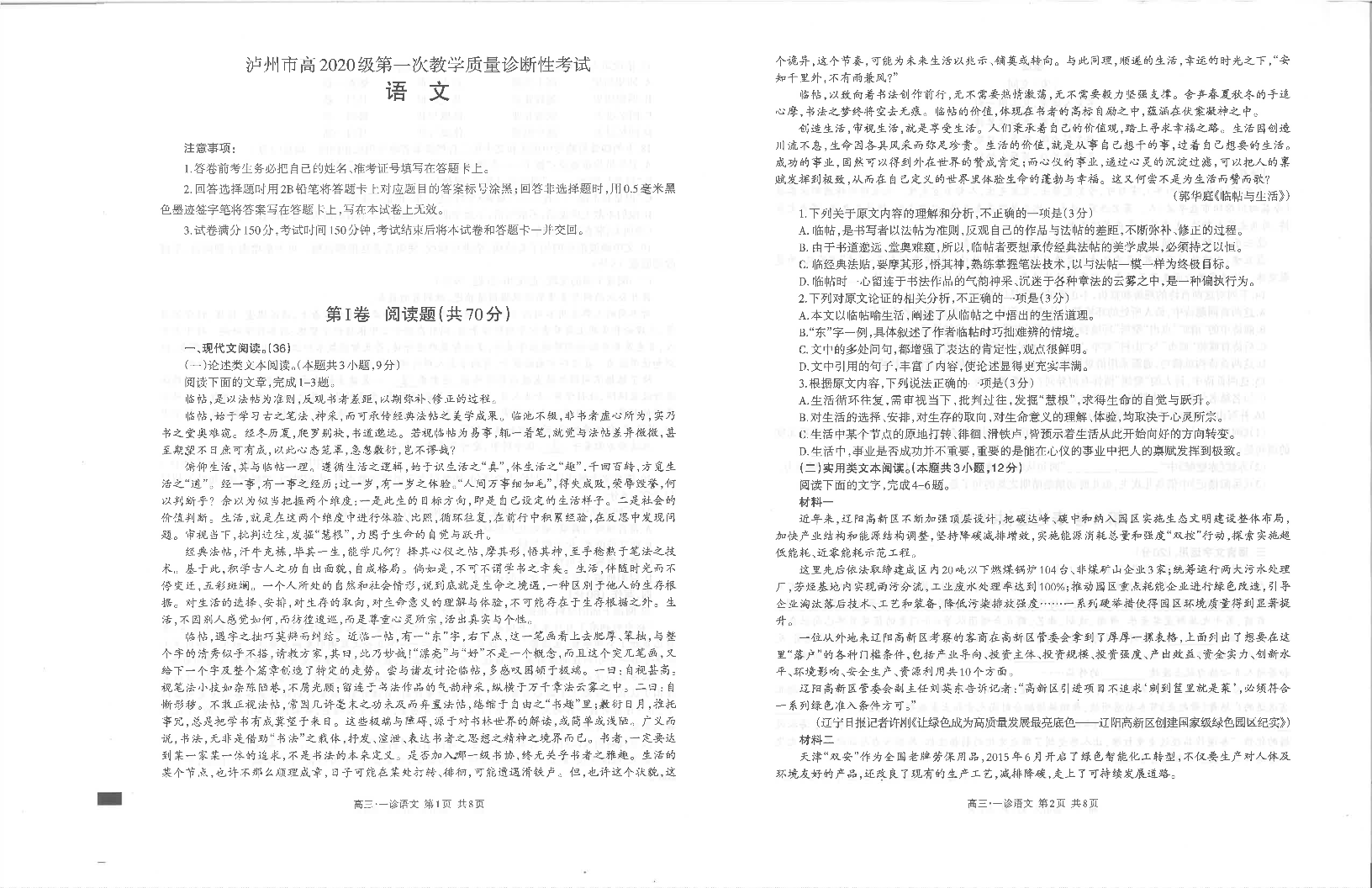 高三语文--四川省泸州市高2023届三上学期第一次教学质量诊断性考试
