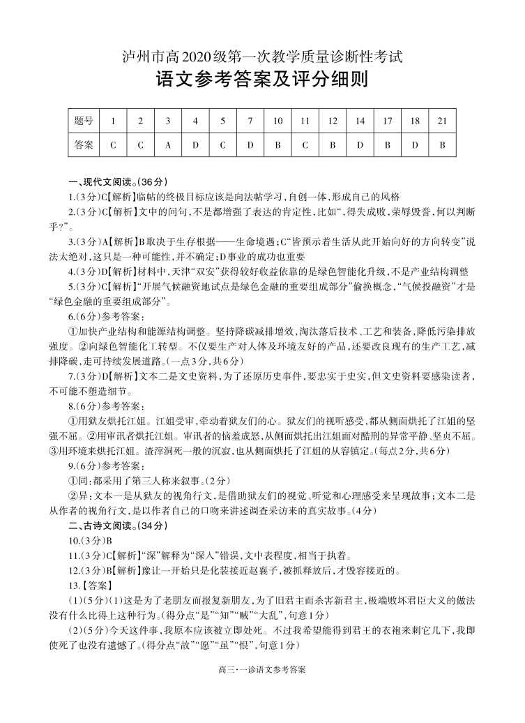 高三语文答案--四川省泸州市高2023届三上学期第一次教学质量诊断性考试