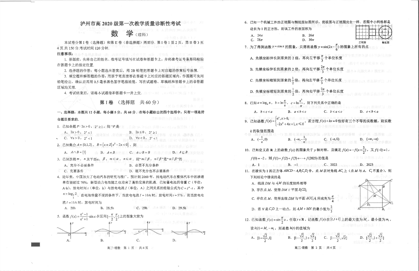 高三理数--四川省泸州市高2023届三上学期第一次教学质量诊断性考试
