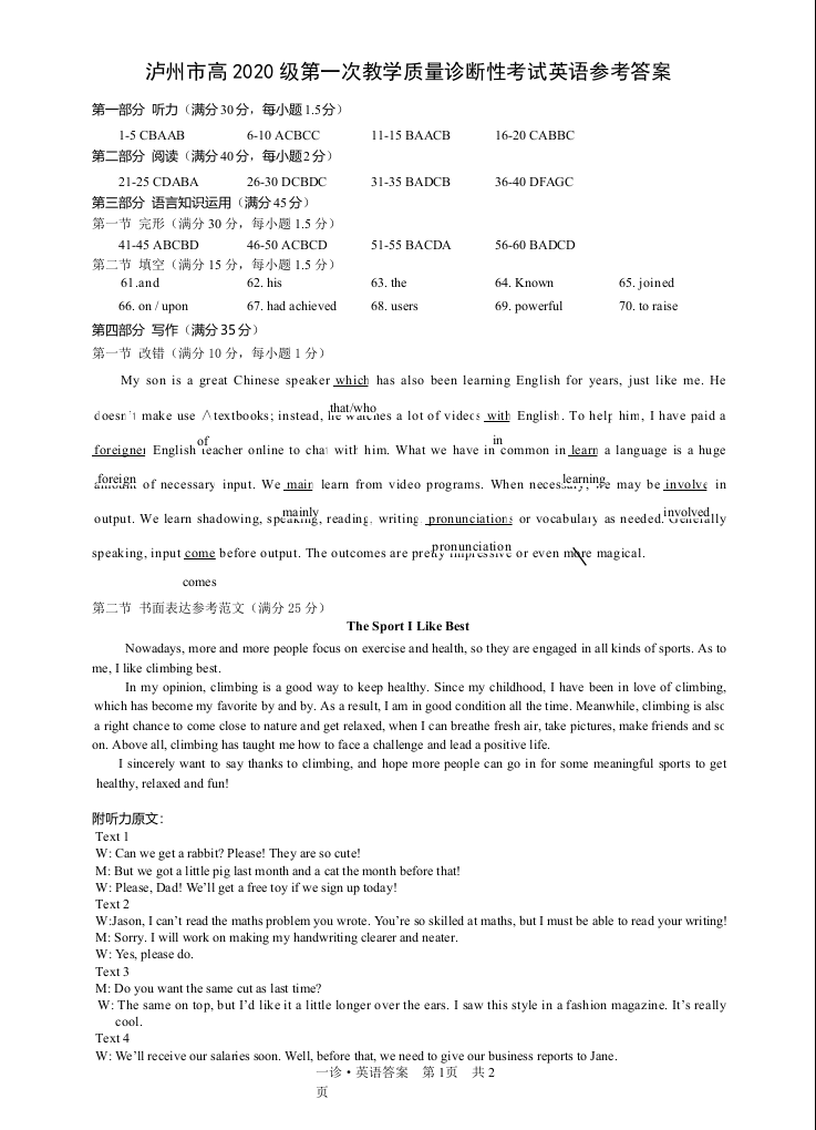 高三英语答案--四川省泸州市高2023届三上学期第一次教学质量诊断性考试