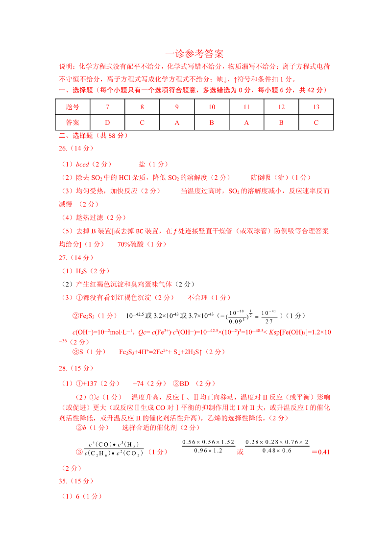 高三理综化学答案--四川省泸州市高2023届三上学期第一次教学质量诊断性考试