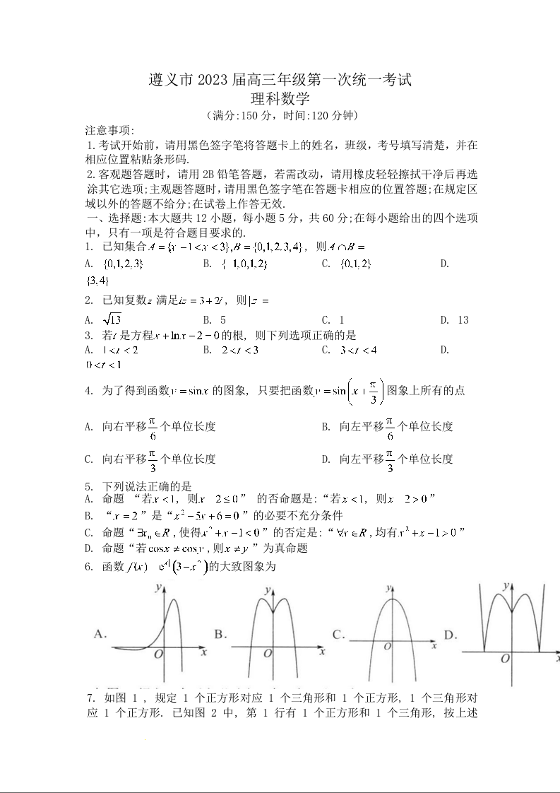 高三理数--贵州省遵义市2023届高三上学期第一次统一考试