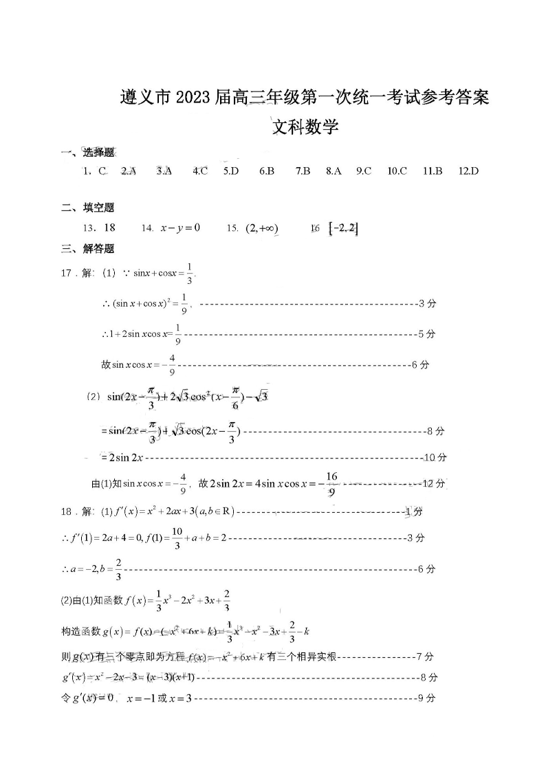 高三文数答案--贵州省遵义市2023届高三上学期第一次统一考试