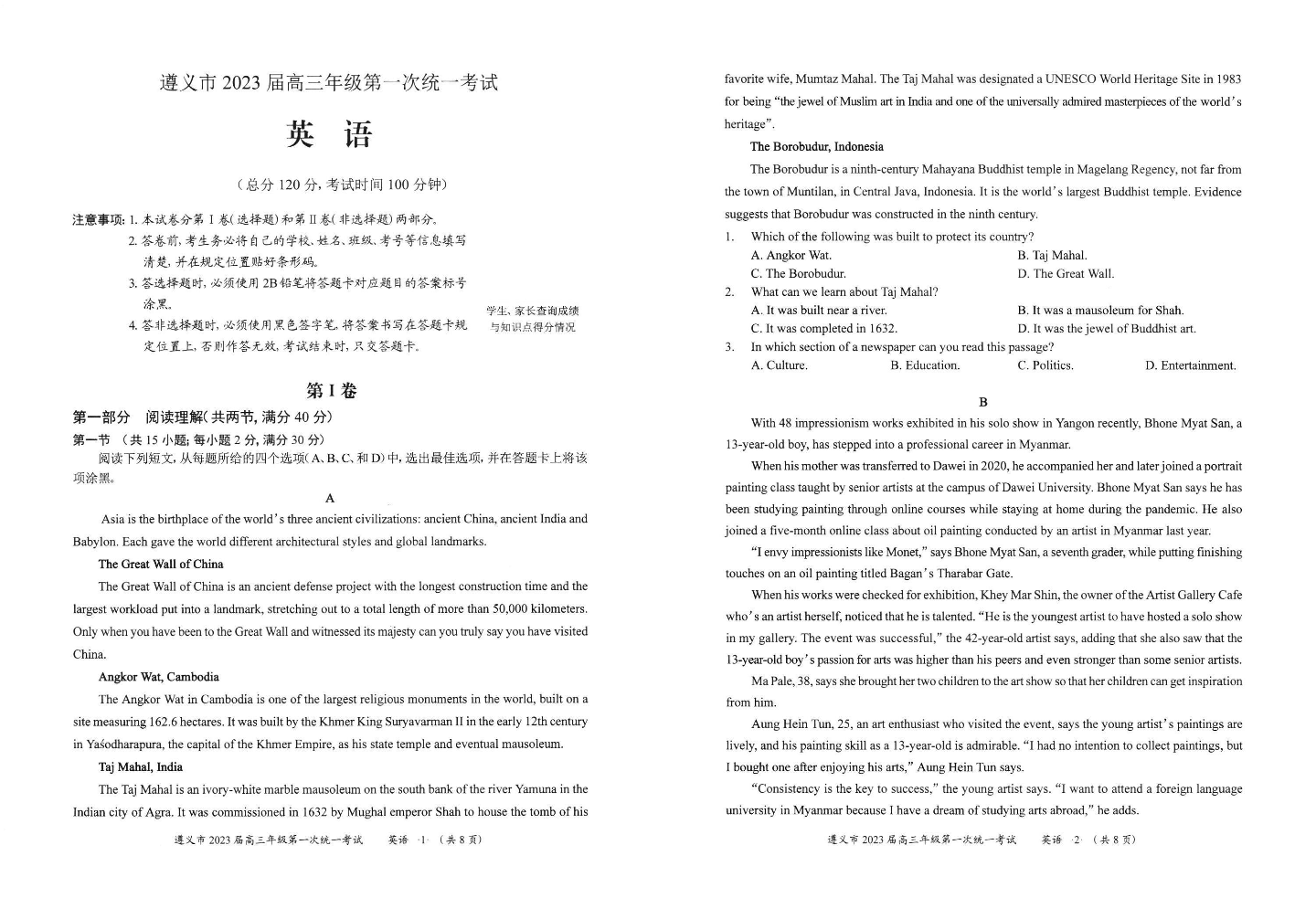 高三英语--贵州省遵义市2023届高三上学期第一次统一考试