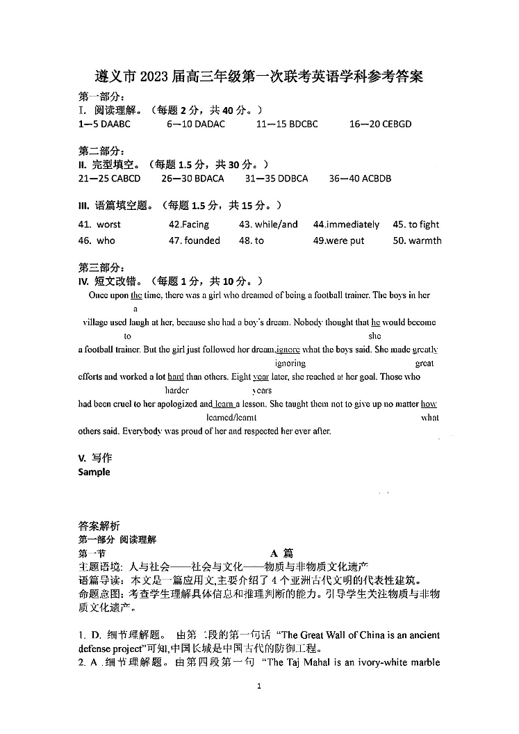 高三英语答案--贵州省遵义市2023届高三上学期第一次统一考试