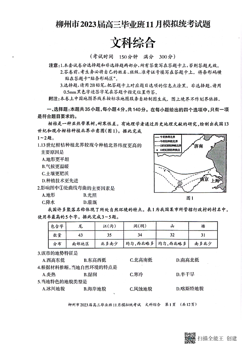 高三文综--广西壮族自治区柳州市2023届高三毕业班11月模拟统考(一模)