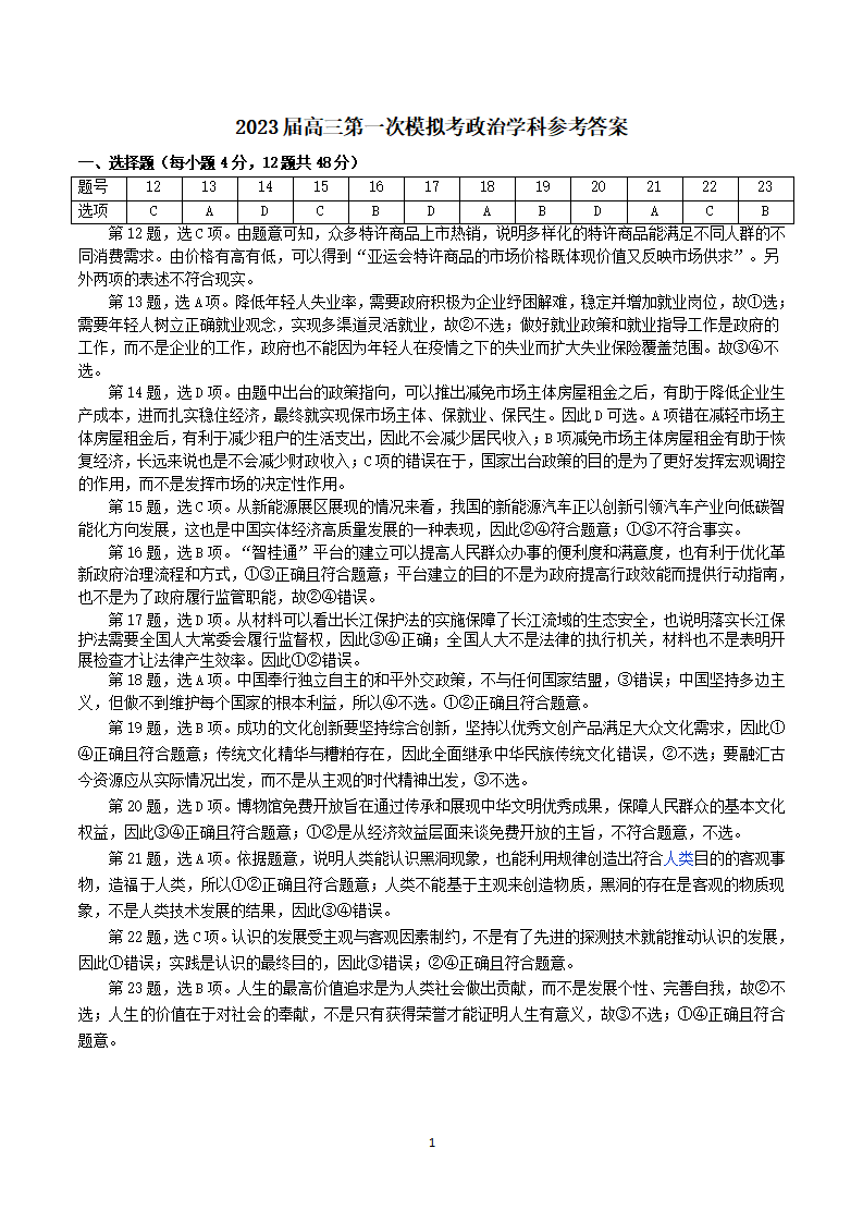 高三文综政治答案--广西壮族自治区柳州市2023届高三毕业班11月模拟统考(一模)