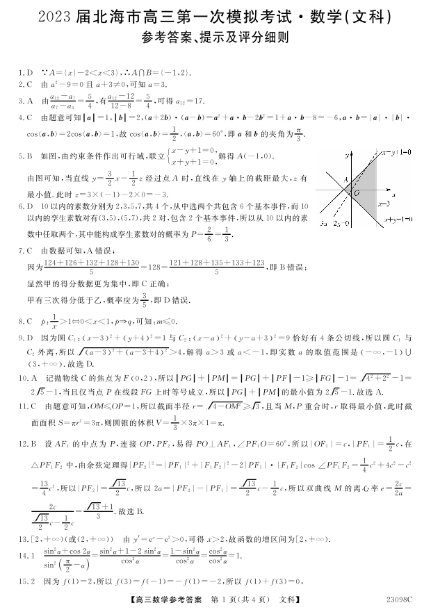 高三文数答案--广西北海市2023届高三上学期第一次模拟考试