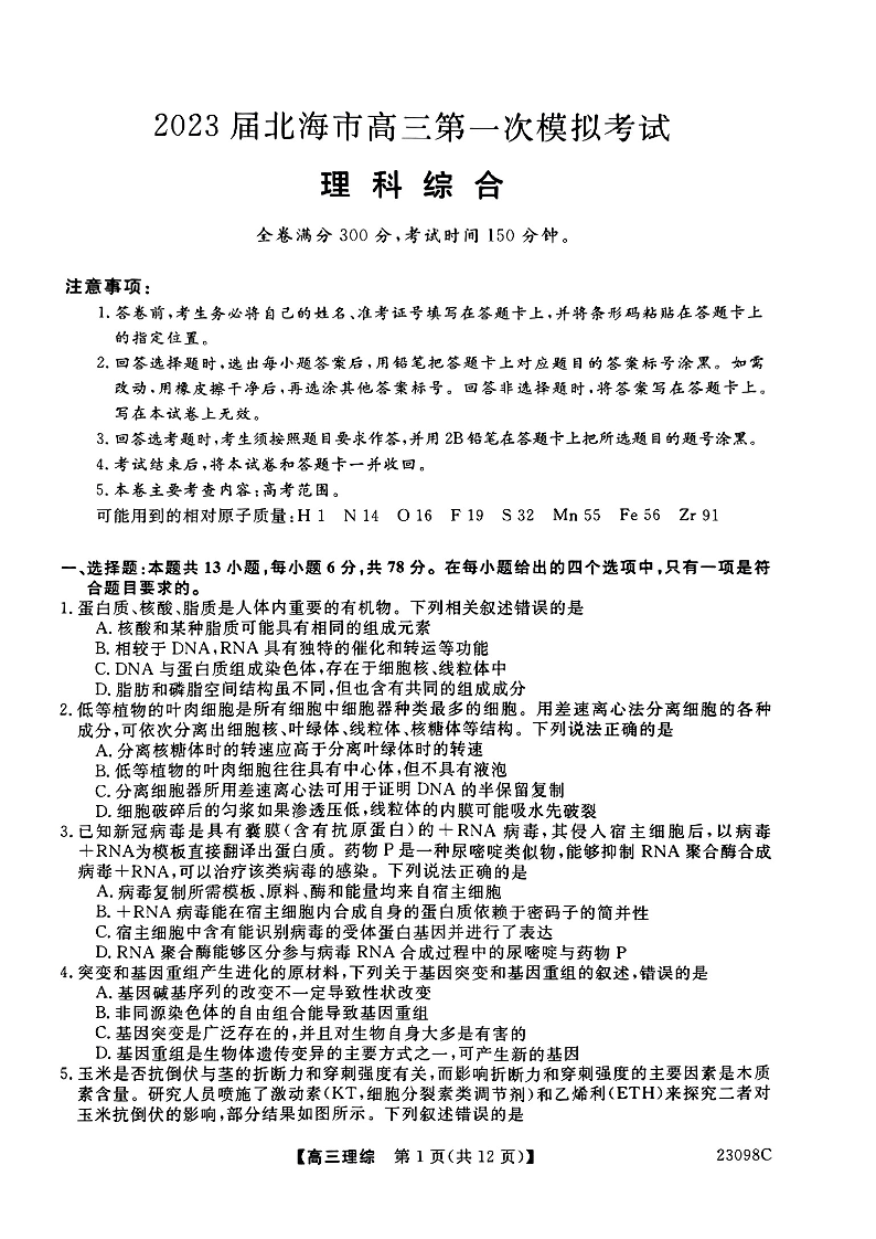 高三理综--广西北海市2023届高三上学期第一次模拟考试
