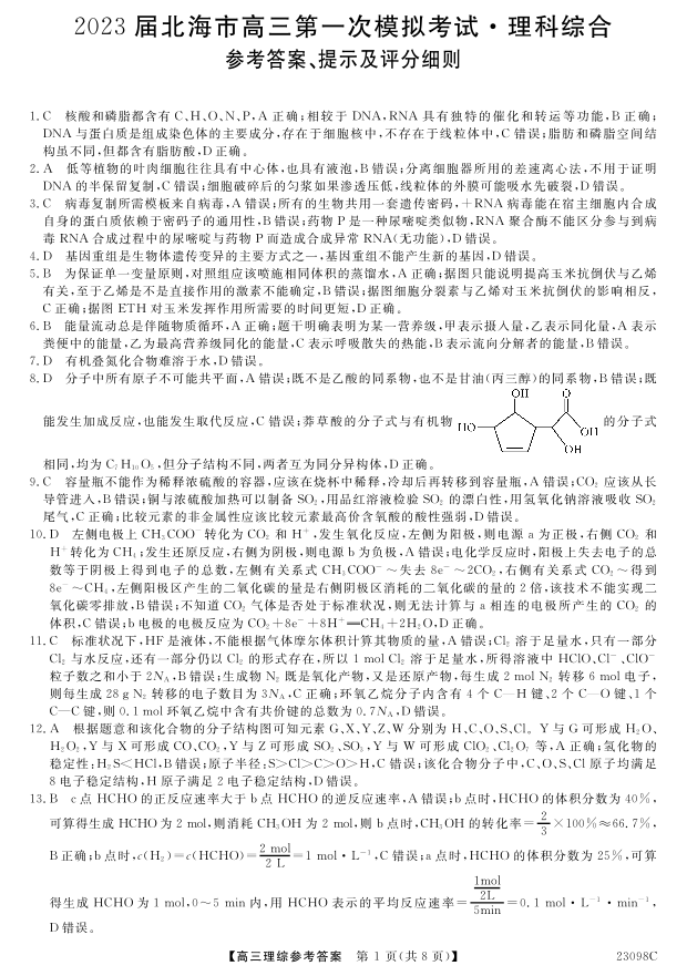高三理综答案--广西北海市2023届高三上学期第一次模拟考试