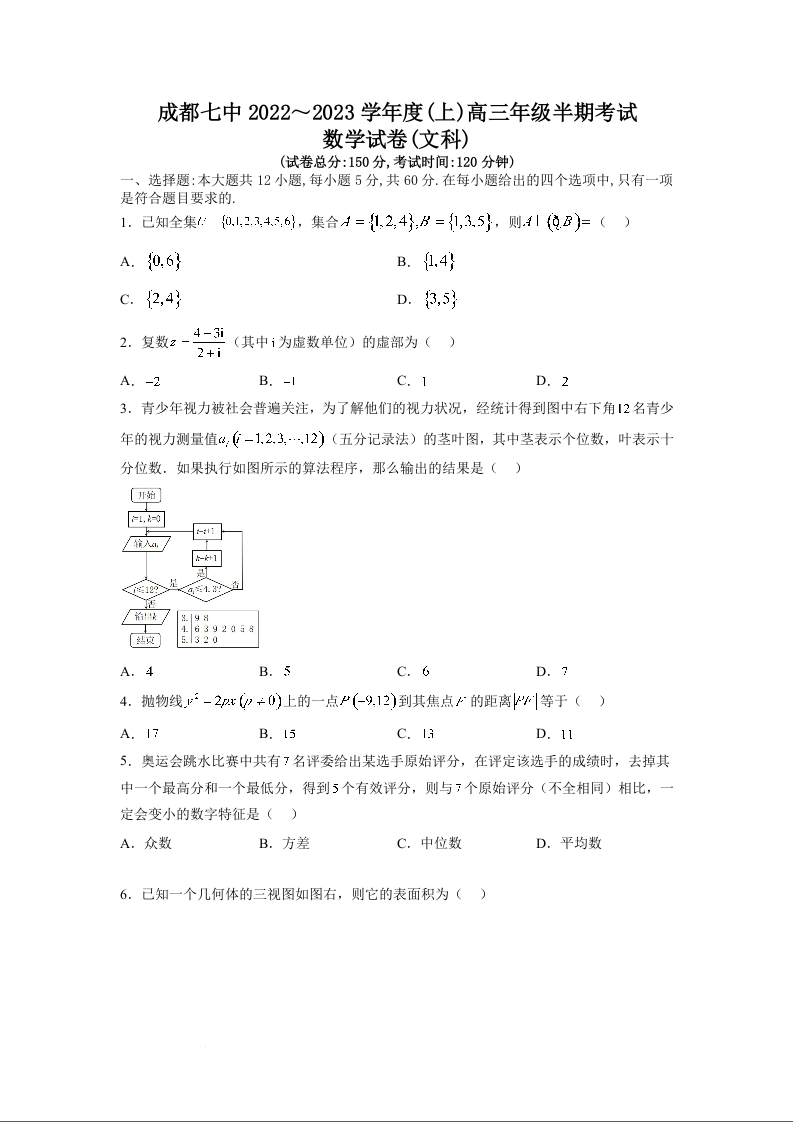 高三文数--四川省成都市第七中学2023高三上学期期中考试