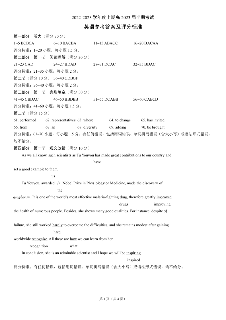 高三英语答案--四川省成都市第七中学2023高三上学期期中考试