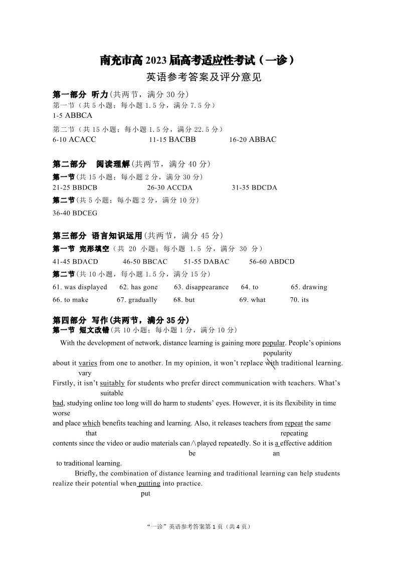 高三英语答案--四川省南充市2023届高三上学期高考适应性考试(南充一诊)
