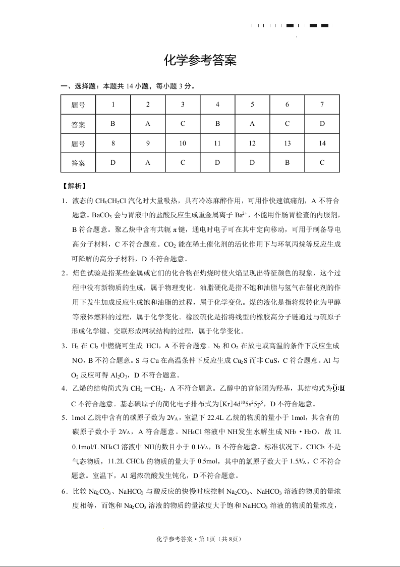 高三化学答案--云南省云师大附中2023届高三考适应性月考卷(一)