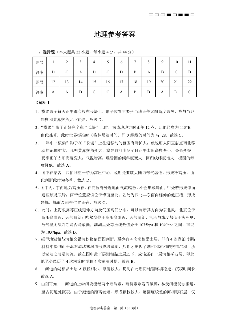 高三地理答案--云南省云师大附中2023届高三考适应性月考卷(一)