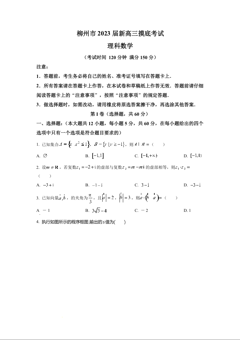 高三理科数学+答案--广西柳州市新2023届高三摸底考试