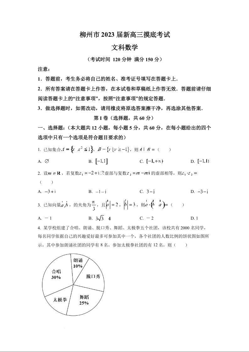 高三文科数学+答案--广西柳州市新2023届高三摸底考试