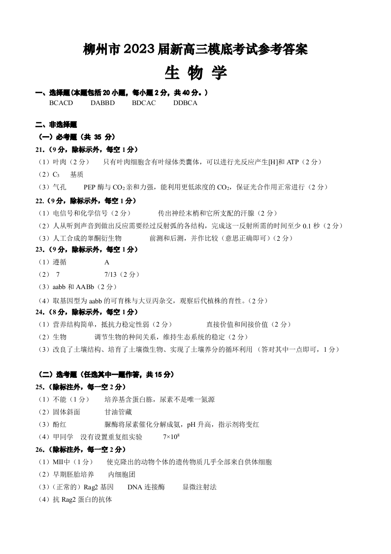 高三生物答案--广西柳州市新2023届高三摸底考试
