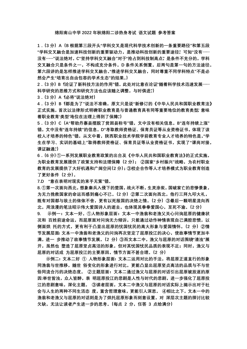 高三语文答案--四川省绵阳市南山中学2022-2023学年高三上学期二诊热身考试