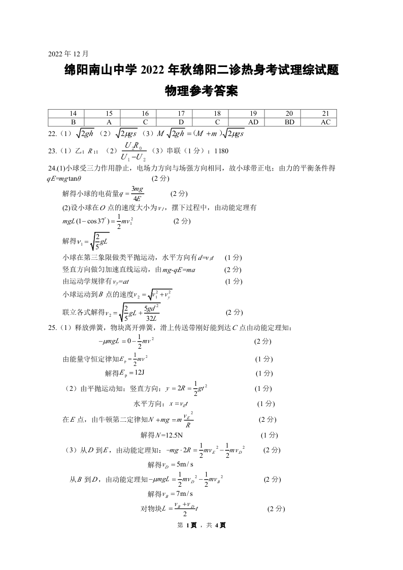 高三理综答案--四川省绵阳市南山中学2022-2023学年高三上学期二诊热身考试
