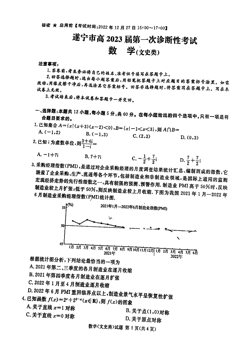 高三文数+答案--四川省广安、遂宁、眉山、雅安、广元、资阳2023届高三上学期第一次诊断性考试