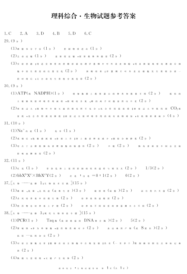 高三理综生物答案--四川省广安、遂宁、眉山、雅安、广元、资阳2023届高三上学期第一次诊断性考试