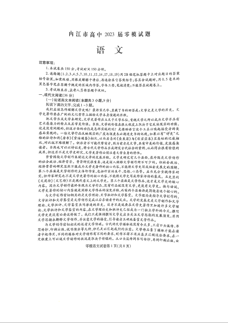 高三语文--四川省内江市2023届高三上学期(零模)