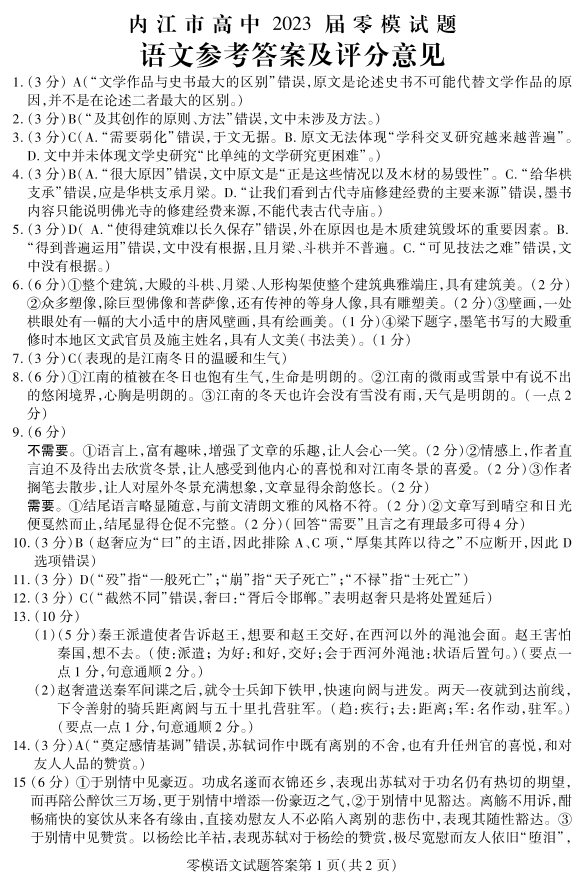 高三语文答案--四川省内江市2023届高三上学期(零模)