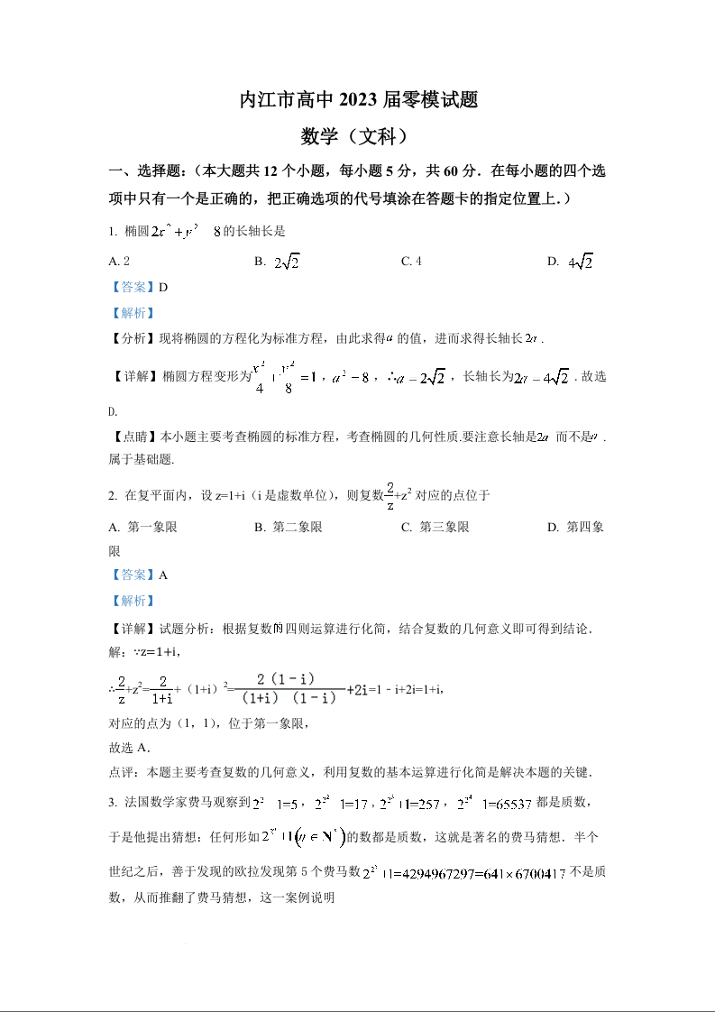高三文科数学(解析版)--四川省内江市2023届高三上学期(零模)