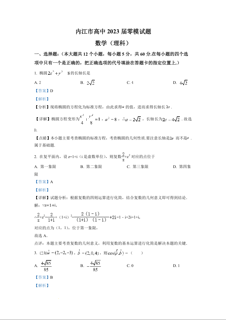 高三理科数学(解析版)--四川省内江市2023届高三上学期(零模)
