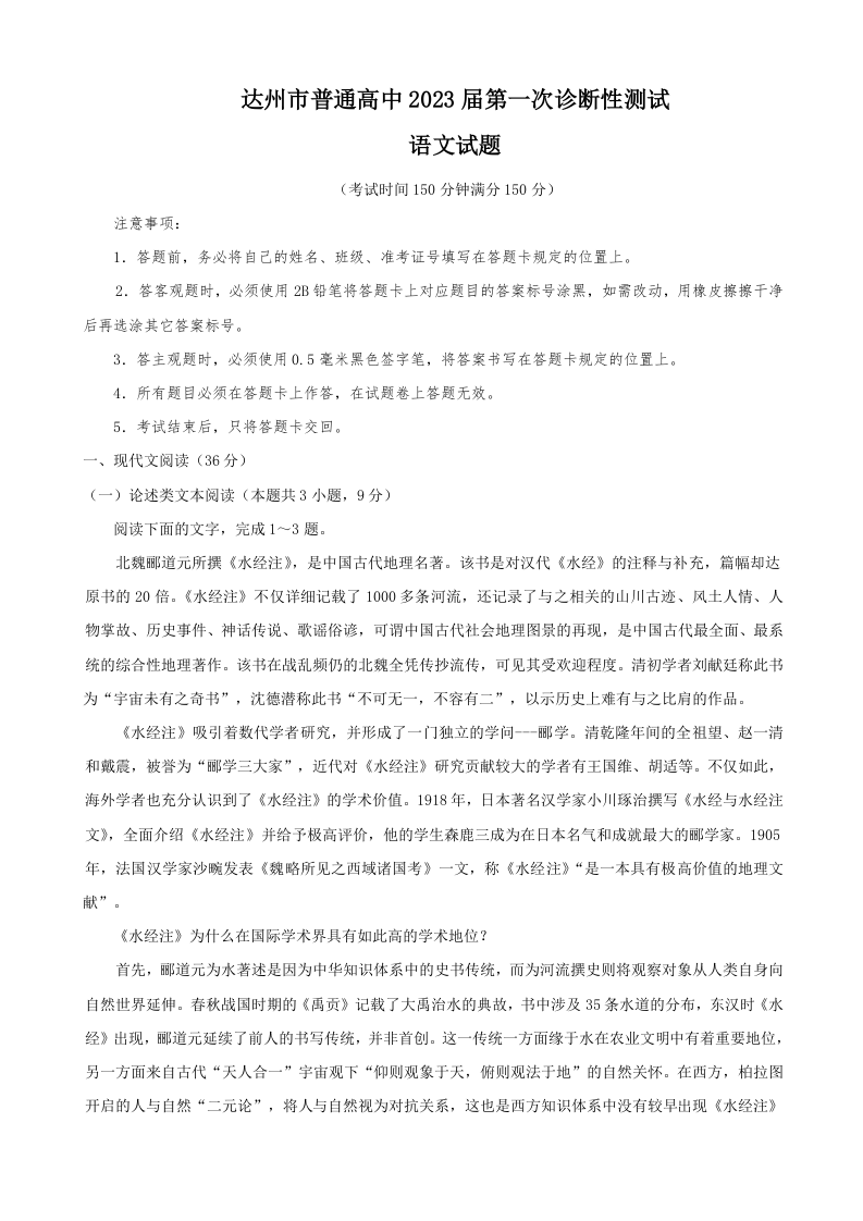 高三语文--四川省达州市普通高中2023届高三第一次诊断性测试
