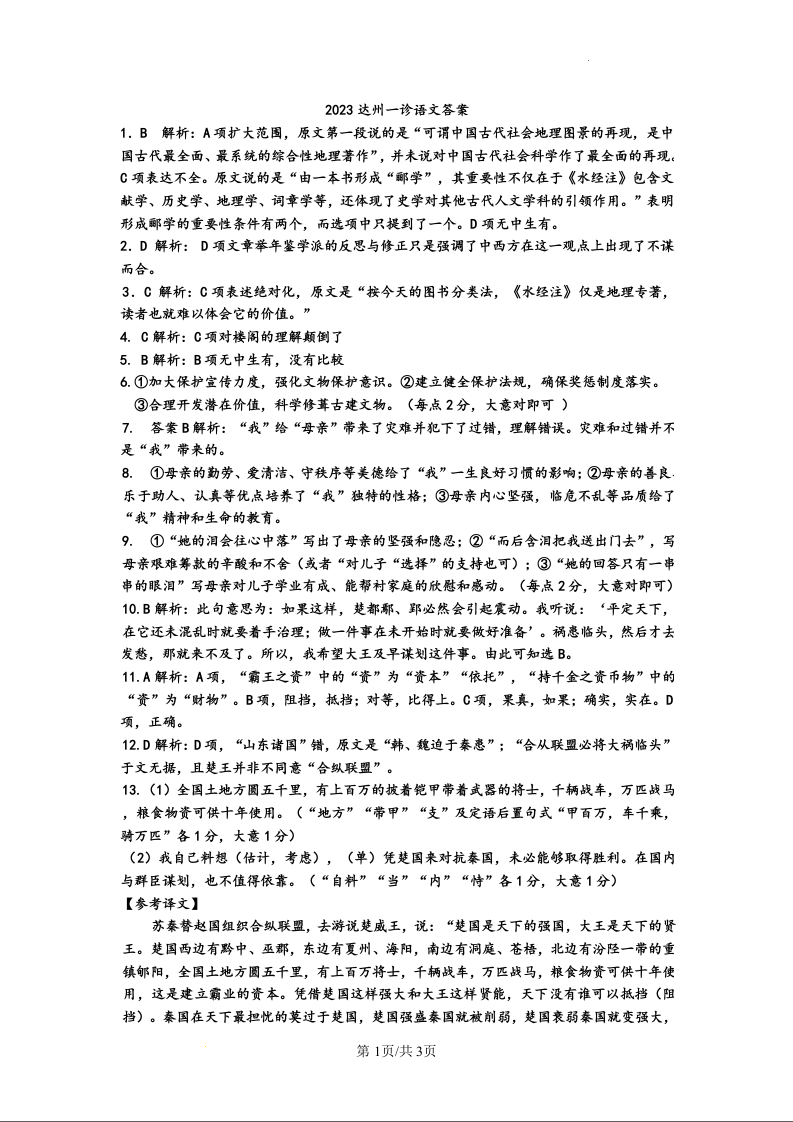 高三语文答案--四川省达州市普通高中2023届高三第一次诊断性测试
