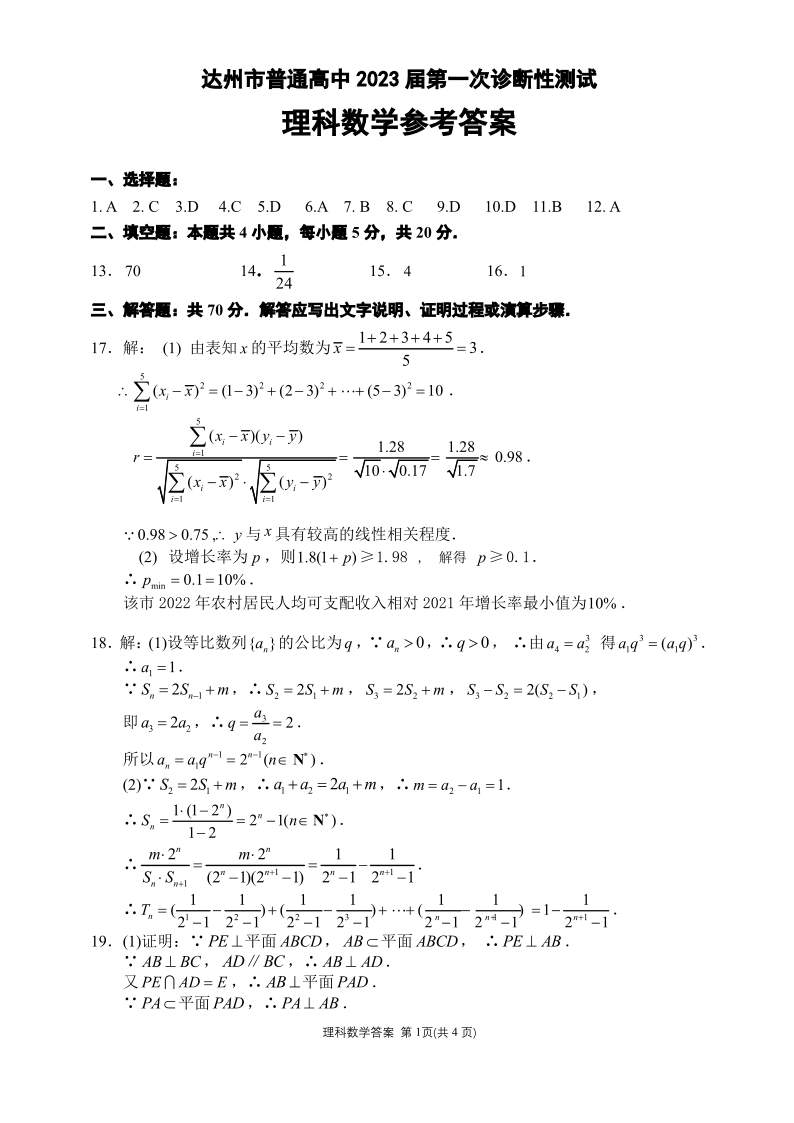 高三理数答案--四川省达州市普通高中2023届高三第一次诊断性测试