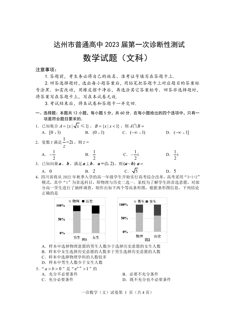 高三文数--四川省达州市普通高中2023届高三第一次诊断性测试
