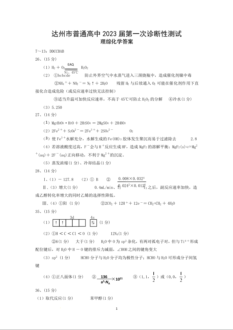 高三理综化学答案--四川省达州市普通高中2023届高三第一次诊断性测试