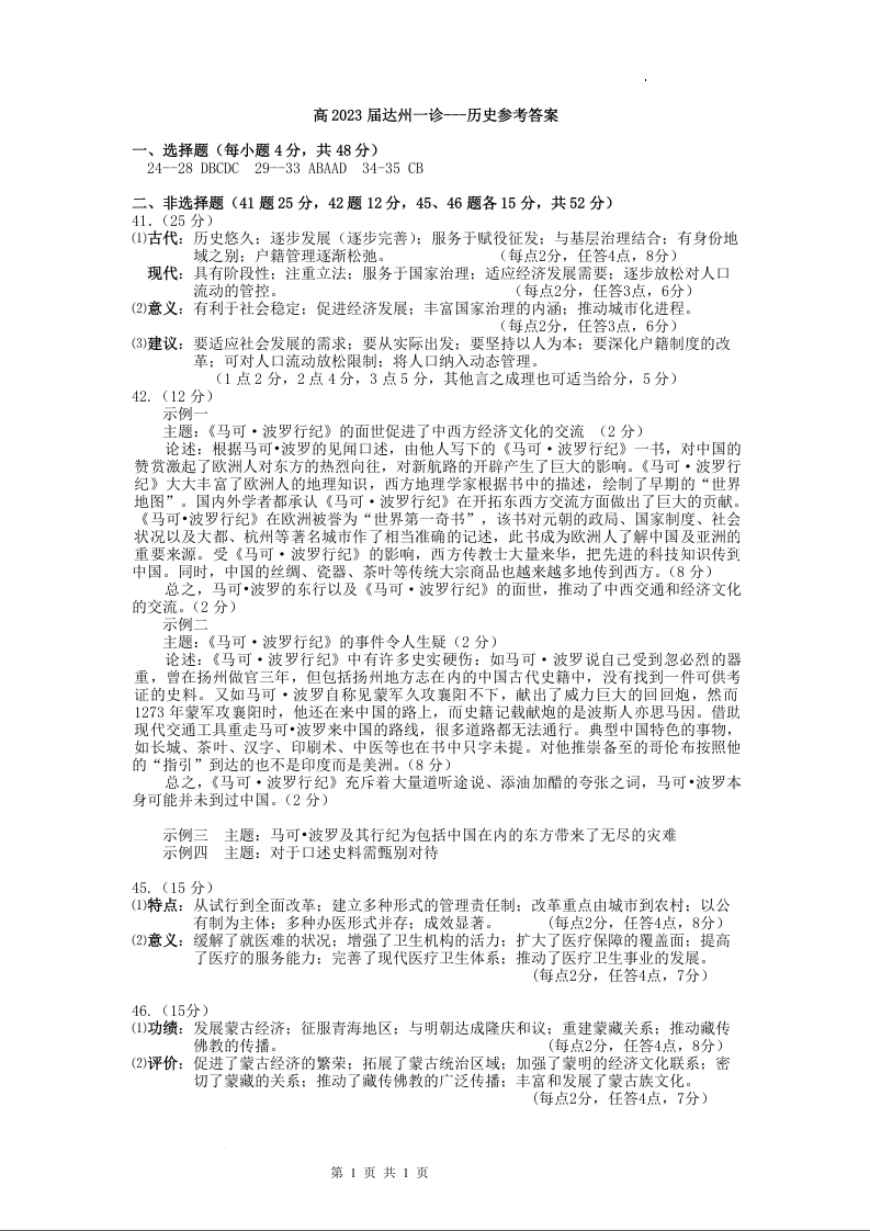 高三文综历史答案--四川省达州市普通高中2023届高三第一次诊断性测试