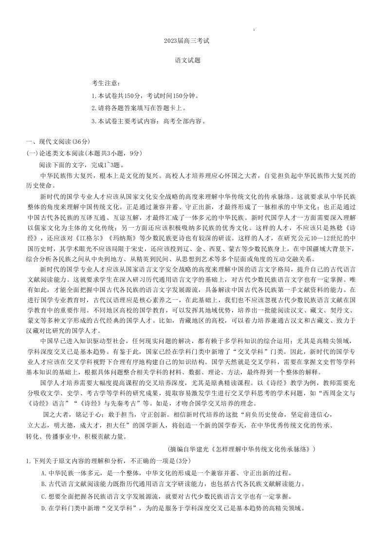 高三语文--四川省部分学校2023届高三上学期12月大联考