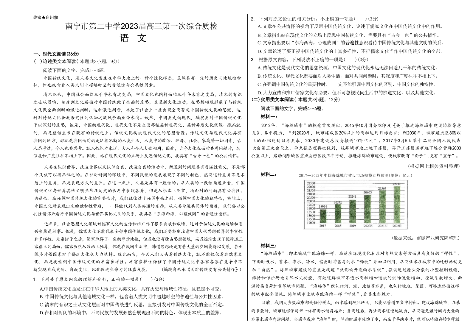 高三语文--广西壮族自治区南宁市第二中学2023届高三第一次综合质检(一模)