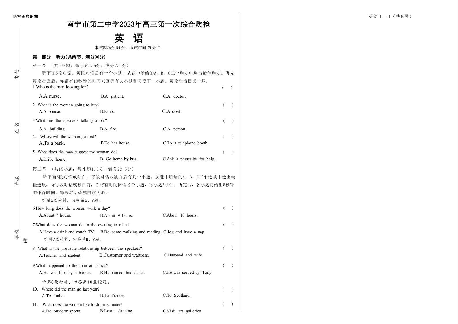 高三英语--广西壮族自治区南宁市第二中学2023届高三第一次综合质检(一模)